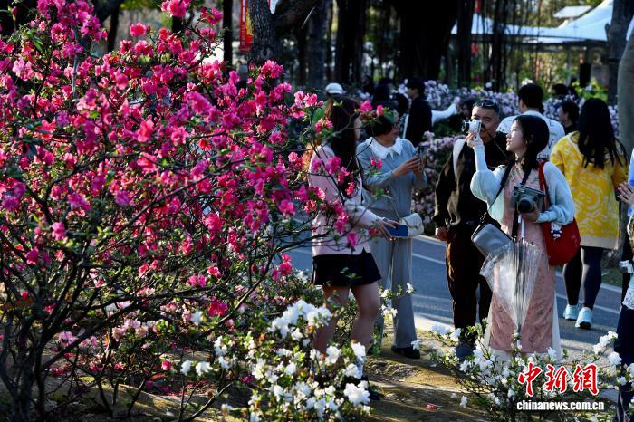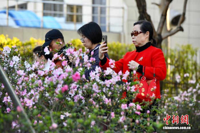 3月15日,祸修祸州,公众正在琴亭湖花园鉴赏杜鹃花。不日,祸州气候阴美,很多花园花朵开放迎客。中新社记者 王东亮 摄