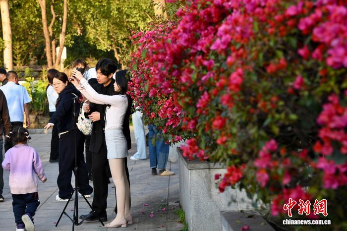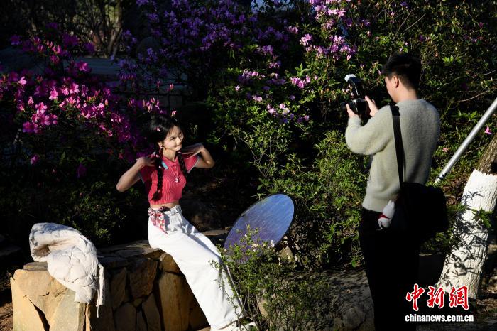 3月15日,祸修祸州,市平易近正在琴亭湖花园杜鹃花前留影。即日,祸州天色阴佳,很多花园花朵怒放迎客。中新社记者 王东亮 摄