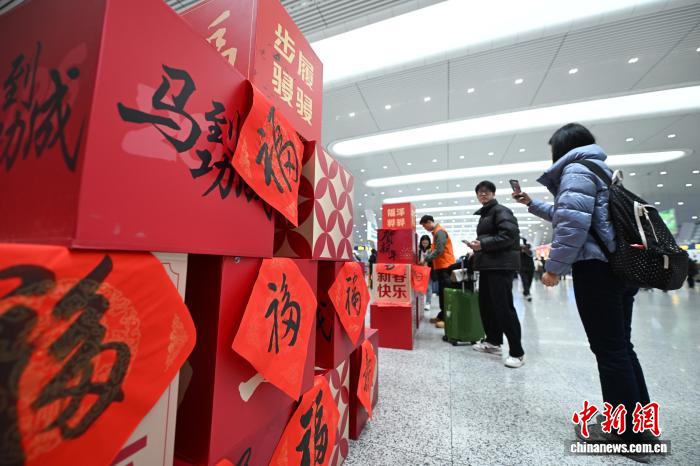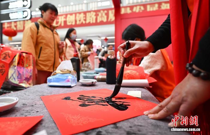 书法意愿者为搭客誊写百般喜庆字帖。中新社记者 王刚刚 摄