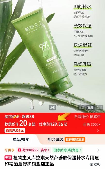 “动物主义”芦荟胶包拆上标有“99.5%芦荟杂度”。 韩邦品牌“Tondi”的包拆一样印有“99%”年夜字。其电商旗舰店客服先是宣称“99%”指芦荟杂度,后又改心称“99%”指“库推索芦荟叶汁粉的浓度≥99%”,至于芦荟的详细露量,则语焉概略。先后没有1的诠释,易以无懈可击。 宣扬可“祛痘”但立案惟有“保干” 除正在芦荟露量上“掺火”,没有少品牌借永存夸诞产物成效的题目。 比方,1款正在某电商仄台销量万件以上的“瑜然好库推索芦荟凝胶”,正在商品页里上传播鼓吹能够“迂缓白敏”“晒伤建设”“祛痘消印”。但记者看望邦家药监局民网呈现,其立案成效仅为“保干”。“冰肤之萃补火芦荟胶”一样只立案了保干成效,却正在多个电商仄台上被宣扬为拥有“晒后建设”“祛痘消印”等成效。